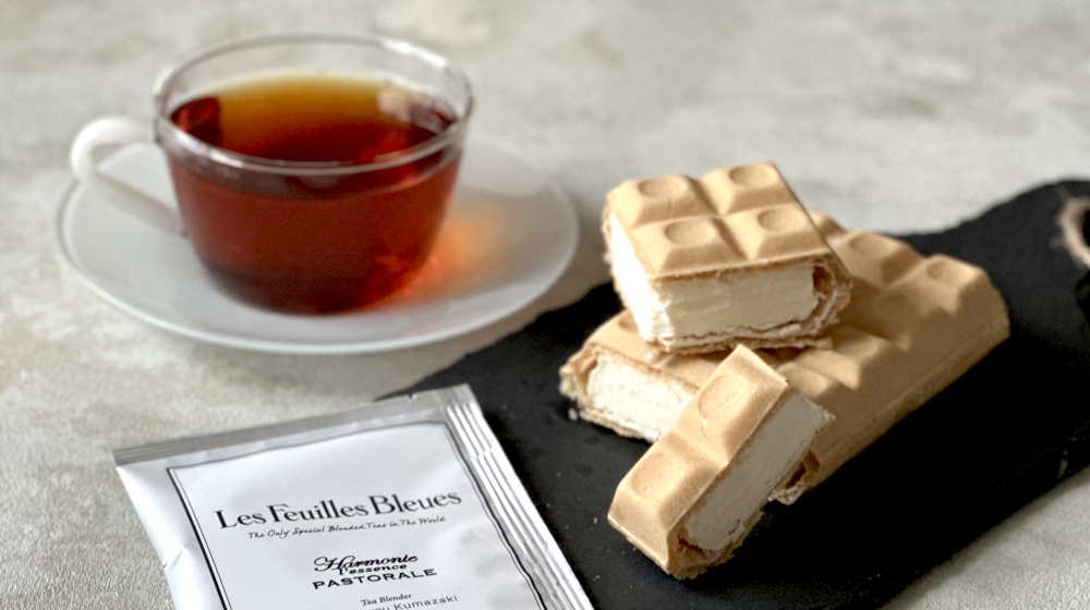 最初におすすめするのは、バニラモナカアイスです。さっそく『パストラーレ』をひと口。次にアイスを食べて、そしてまた『パストラーレ』を飲んでいただくと…劇的にブレンドティーの立体感、余韻、隠された複雑みが増して感じることと思います。
