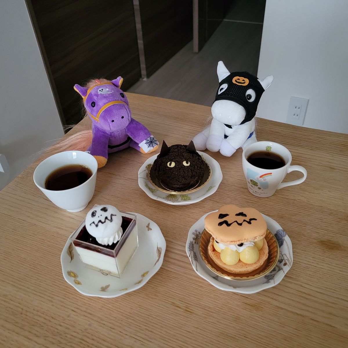 お気に入りのマスコットにハロウィン仕様のコスチュームを付けて、ハロウィンならではのスイーツでティータイム。今回の4ブレンドはハロウィン用に作られたカボチャやチョコなどのケーキにもぴったり。