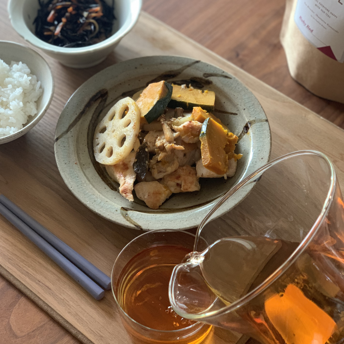 ルビーレッドのルイボスティーのほどよい香味や紅茶の穏やかな味わいは和食にもぴったり。マグカップなどでティーバッグを入れたままにして、2煎目、3煎目とお湯を足していくラフな飲み方もよいですし、通常の倍量の400㏄~500㏄のお湯で一気に作ってしまい、食中に飲んでもおいしい食事のお供になります。