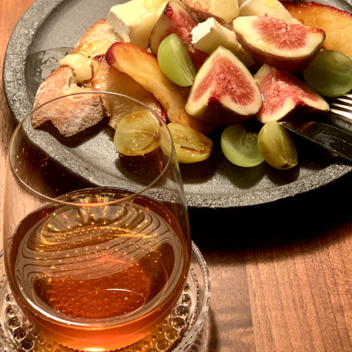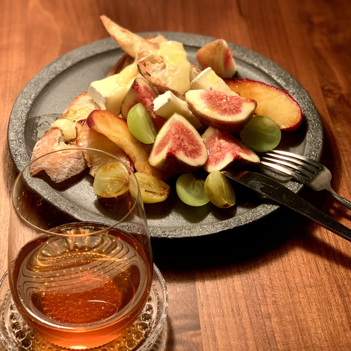 フルーツはオリーブオイルで焼くと甘味も強くなるので、生と焼いたものをミックスしてナッツやチーズ、パンなどと一緒に楽しんでいます。こんなひと皿はワインなどのアルコールにもよく合いますが、ワインのように紅茶の香りをじっくり味わいながら楽しんでみるものよい時間です。
