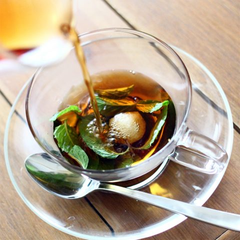 カップにフレッシュミントをちぎって入れ、そこに紅茶を注ぎます。